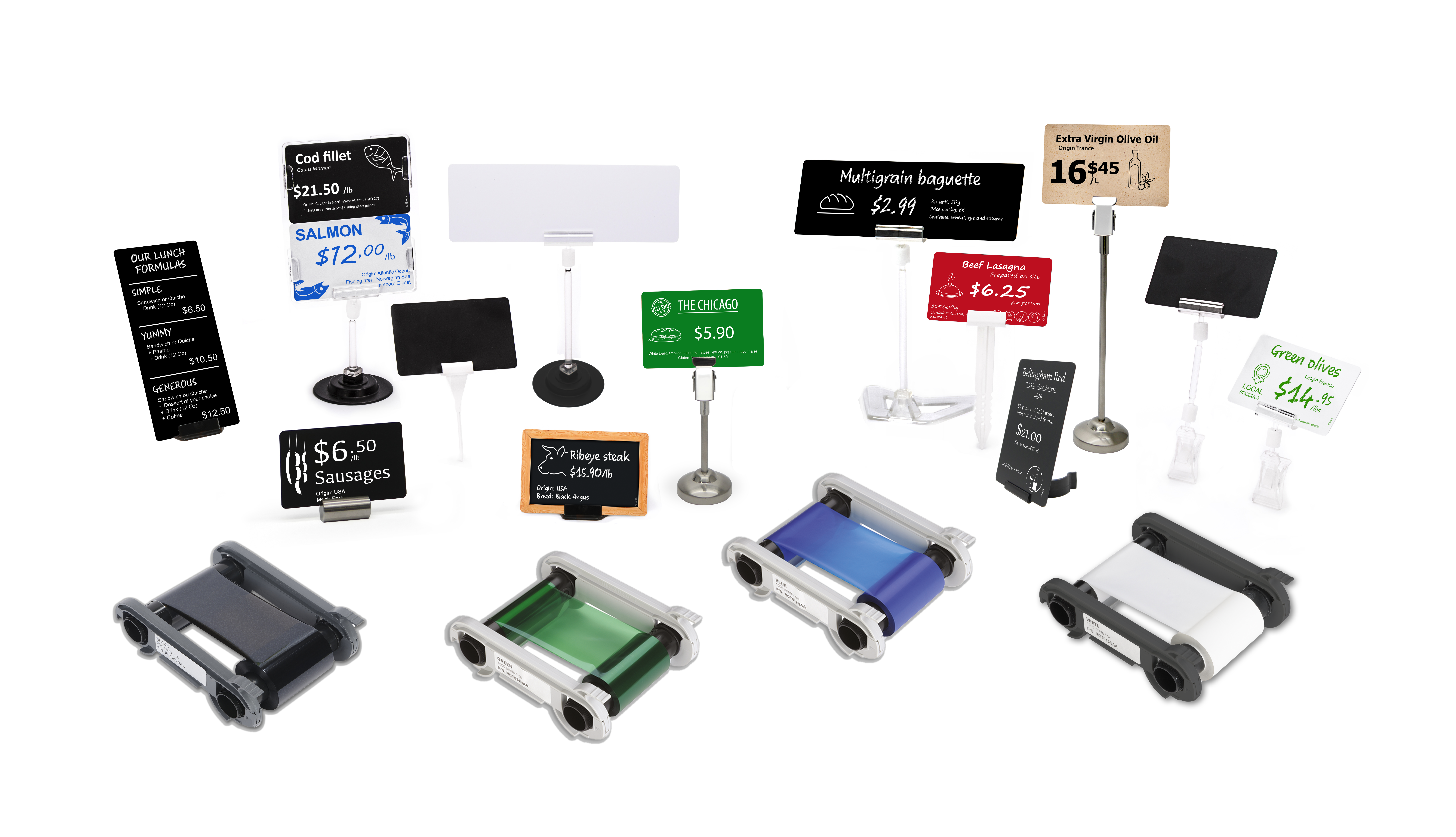 - Des consommables pour débuter vos premières impressions : un ruban d’impression et des cartes PVC dédiées à l’utilisation dans le commerce alimentaire.