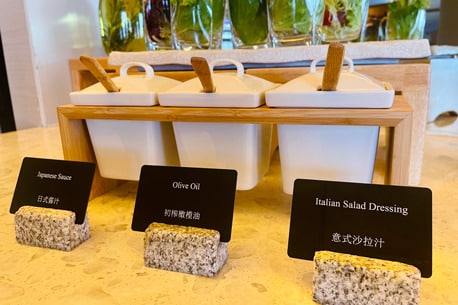 Das Portman Ritz-Carlton verwendet individuell gestaltete Etiketten, um die Speisen in seinem Restaurant Portman und in der Executive Lounge, die beide Buffets anbieten, zu präsentieren. Die Etiketten enthalten individuell gestaltete und gedruckte Karten, auf denen die Preise für Mahlzeiten und Artikel, die in der Ritz Bar & Lounge, in den Teestuben und Souvenirläden verkauft werden, angegeben sind.