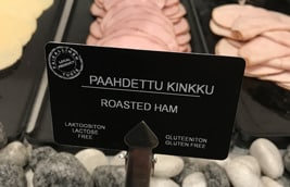 Jedes Hotel hat nun fast 70 Etiketten auf seinem Frühstücksbuffet. Sie zeigen harmonisch, gut lesbar und in drei Sprachen – Finnisch, Englisch und Schwedisch – an :