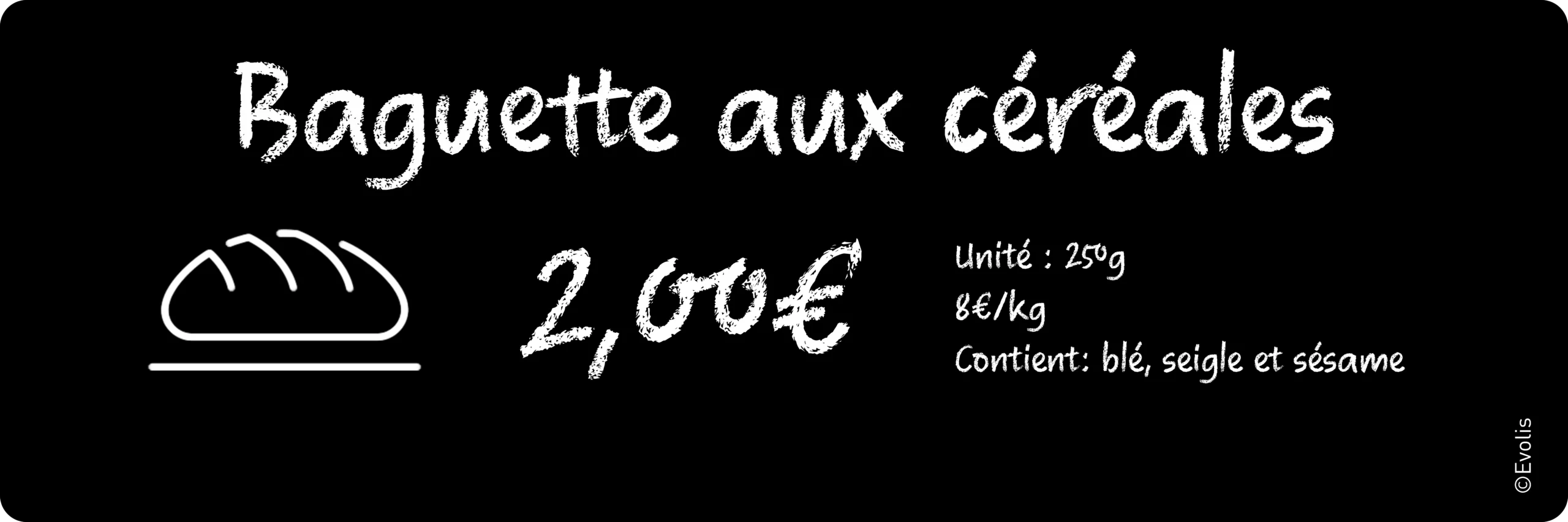 - Ein passendes Format : auf die Größe und Anordnung Ihrer Produkte. Brot z. B. erfordert rechtlich ein bestimmtes Etikettenformat. Sie können sich aber auch für kleinere Etiketten für den Rest Ihres Angebots entscheiden, damit es nicht verdeckt wird.